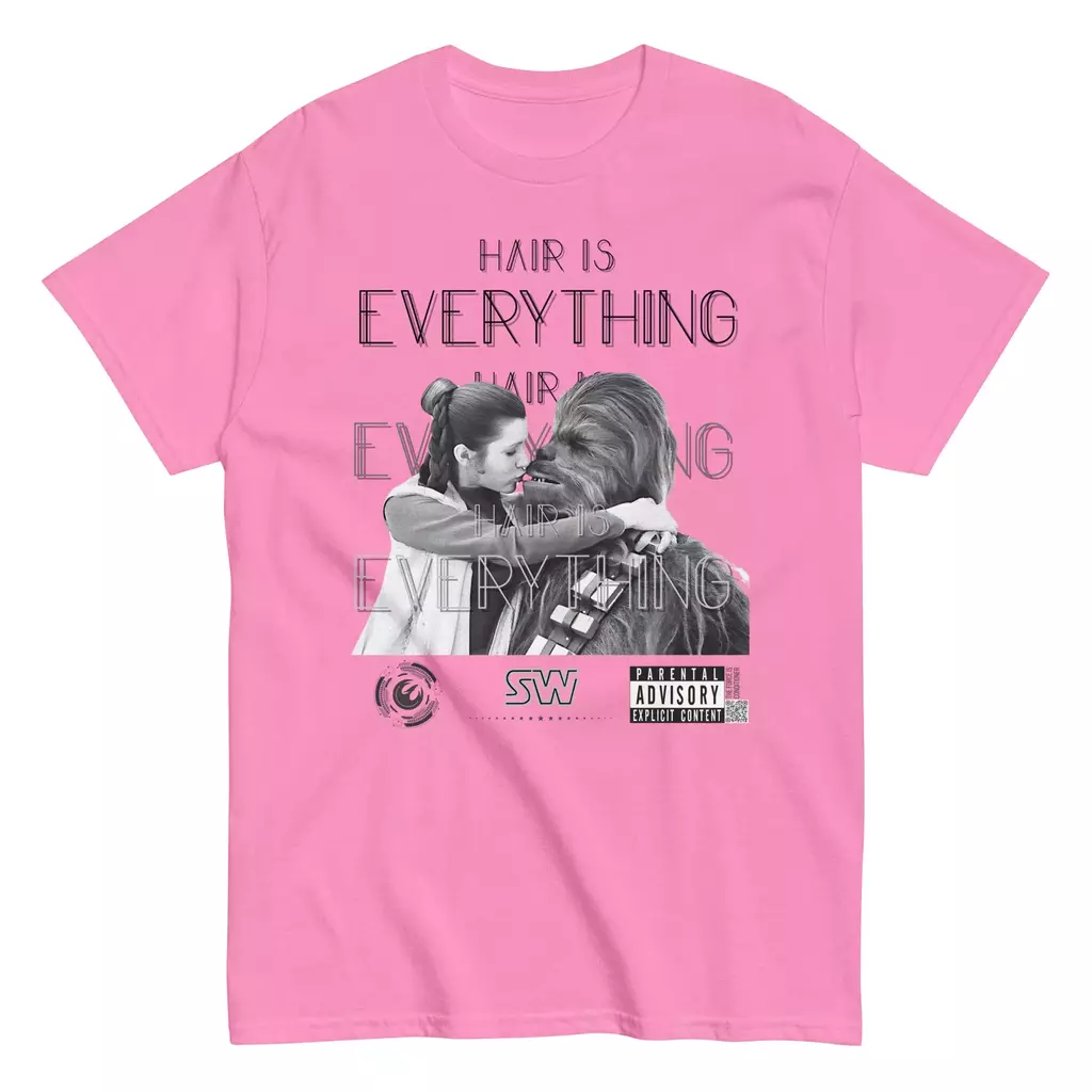 La icónica trenza de Leia Organa se funde con la melena salvaje de Chewbacca en un beso inesperado—porque cuando se trata de estilo galáctico, Hair Is Everything. El diseño en blanco y negro sobre base gris claro repite la frase a distintas opacidades, añade un sello “Parental Advisory” y el logotipo “SW” para un toque irreverente digno de cualquier fan de la saga.